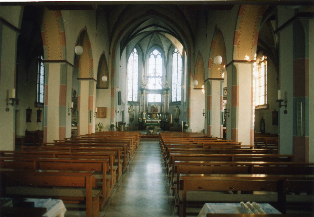 Im Chorraum finden sich Fresken aus dem 15./ 16. Jh, die erst 1953/54 wieder freigelegt wurden. Die Fenster im Chorraum mit Motiven aus dem Leben Mariens stammen aus dem Jahr 1978. Sie wurden nach den Vorlagen des Künstlers Hartmann von der Firma Glasmalerei F. Melchior aus Köln geschaffen. Der Hochaltar stammt aus dem 18. Jh, wurde aber zuletzt in den 1960er Jahren umgebaut. Dabei wurde die große Marienfigur aus dem Hochaltar entfernt und der Hochaltar verkürzt. Die Marienfigur steht nun am Eingang zum Hauptschiff. Heute versinnbildlicht der Hauptaltar mit dem Auge Gottes, der Taube und dem sich opfernden Pelikan die Dreifaltigkeit. Neben dem Hochaltar finden sich der Engel des ewigen Lebens und der Engel des Gerichts, die zusammen mit dem Kreuz im rechten Seitenschiff (16.Jh.) aus der alten Friedhofskapelle stammen. Die Glocke neben dem Eingang zur Sakristei stammt aus dem Jahr 1720.
